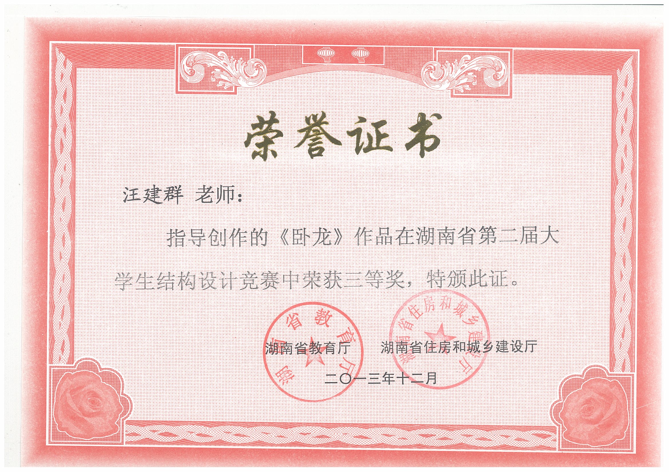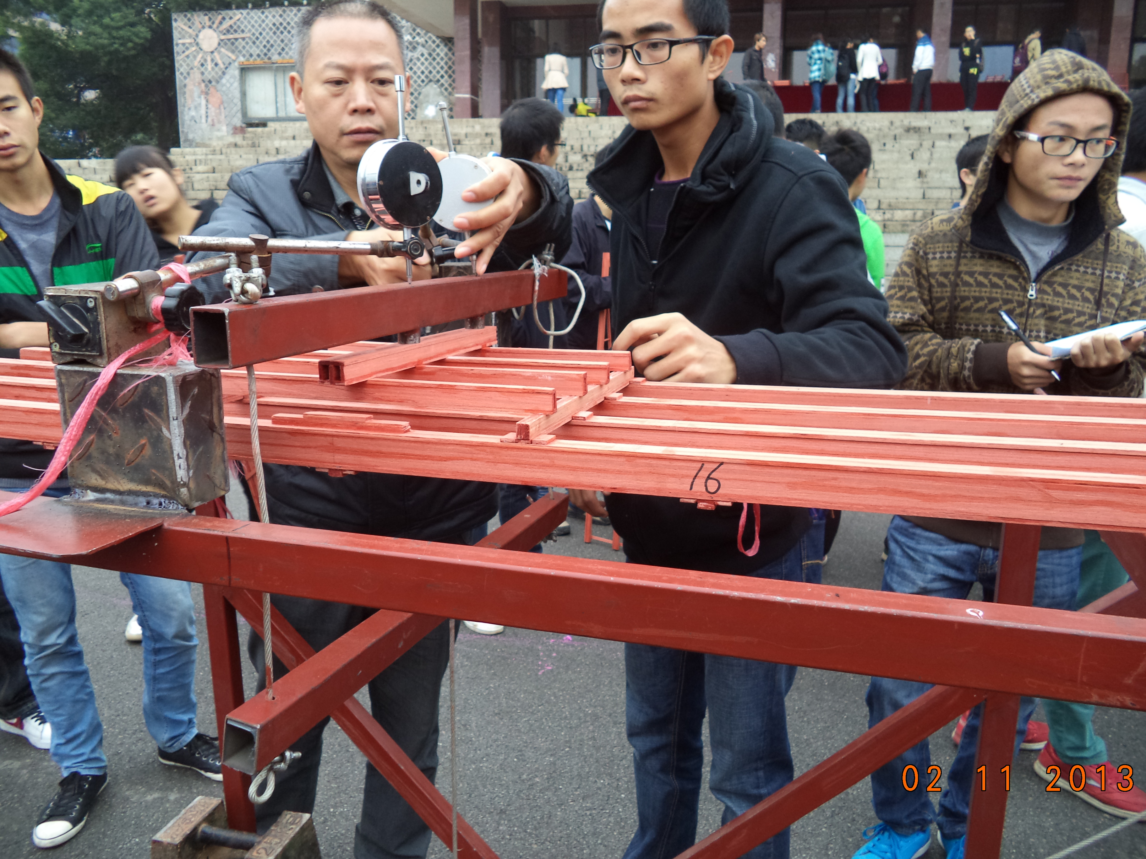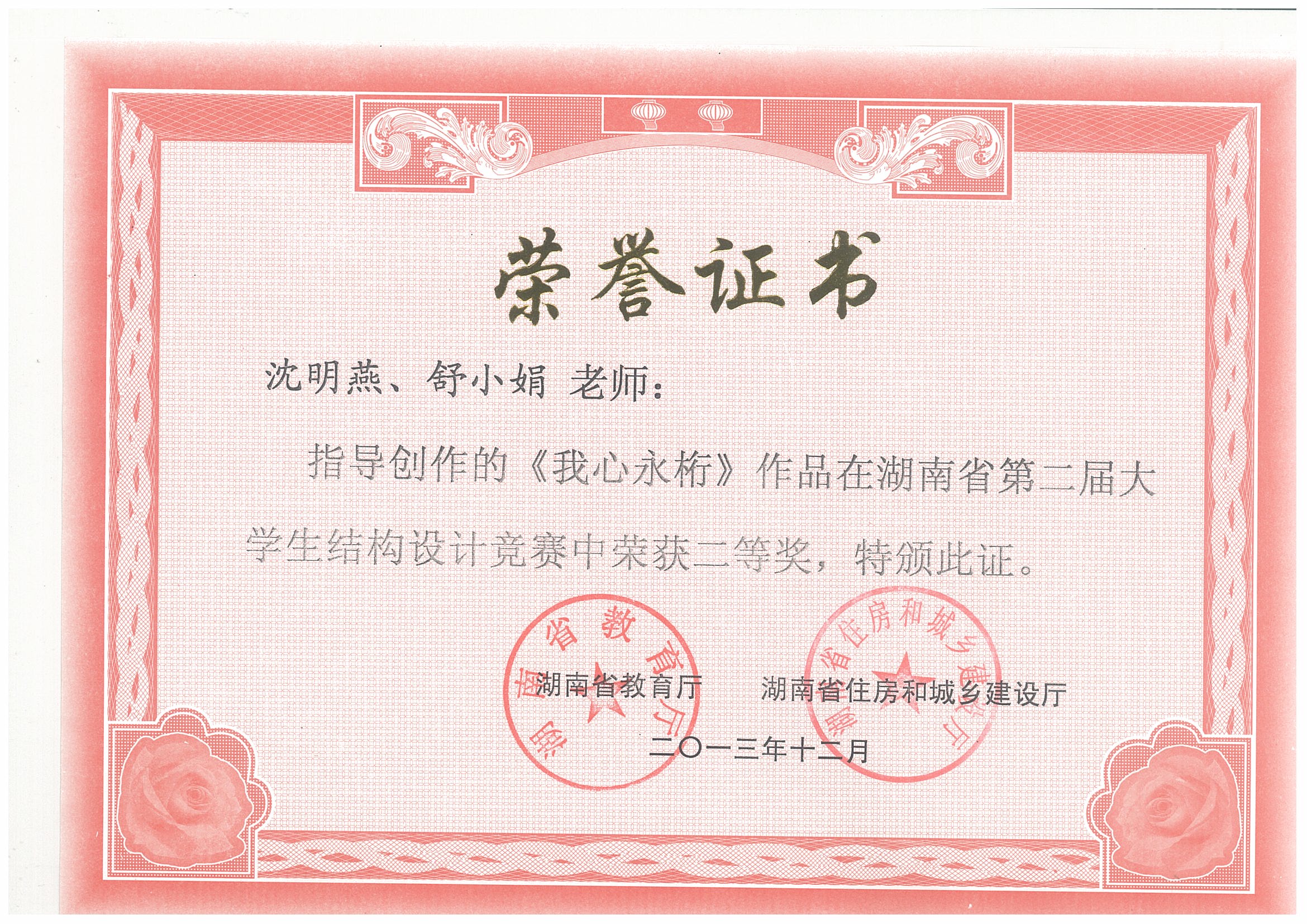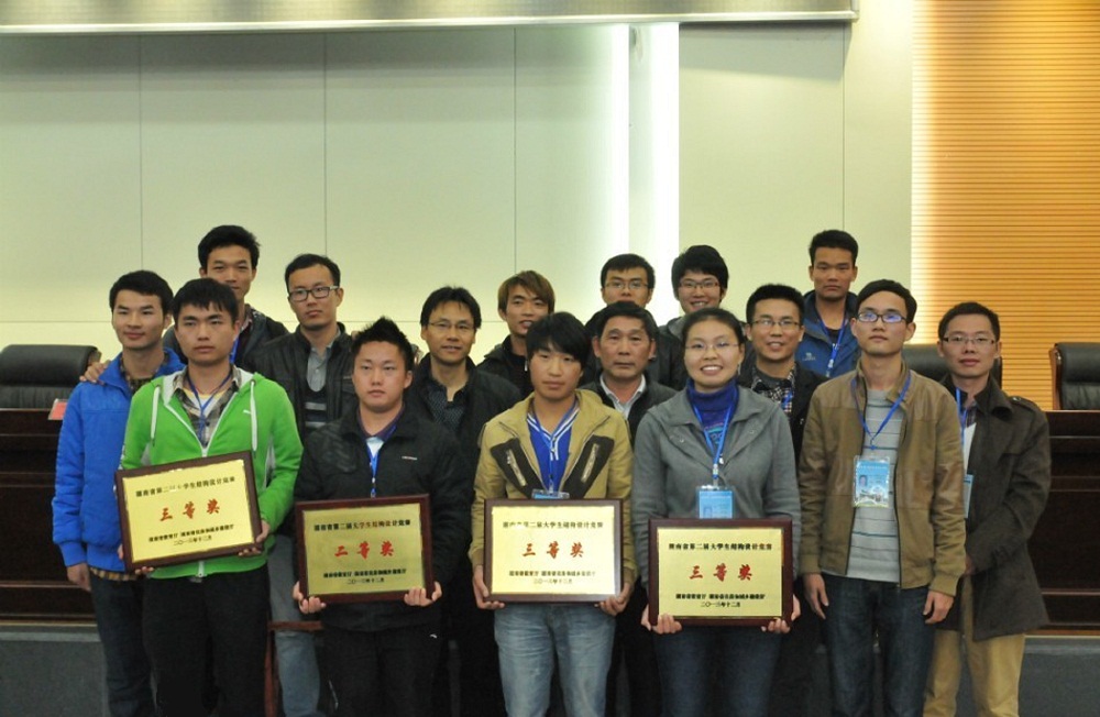 湖南省第二届大学生结构设计竞赛于2013年12月6日至9日在湖南城市学院举行,共56支参赛队伍参加了本届竞赛。足球一世官网组织和选派了4支队伍参加了本次比赛,最终沈明燕和舒小娟两位老师共同指导的参赛作品“我心永桁”荣获二等奖,黄海林、汪建群、李永贵等三位老师指导的作品也均荣获三等奖,团体总成绩进入本届赛事的全省前四,实现了大学生结构设计竞赛相关建设的飞跃式发展。