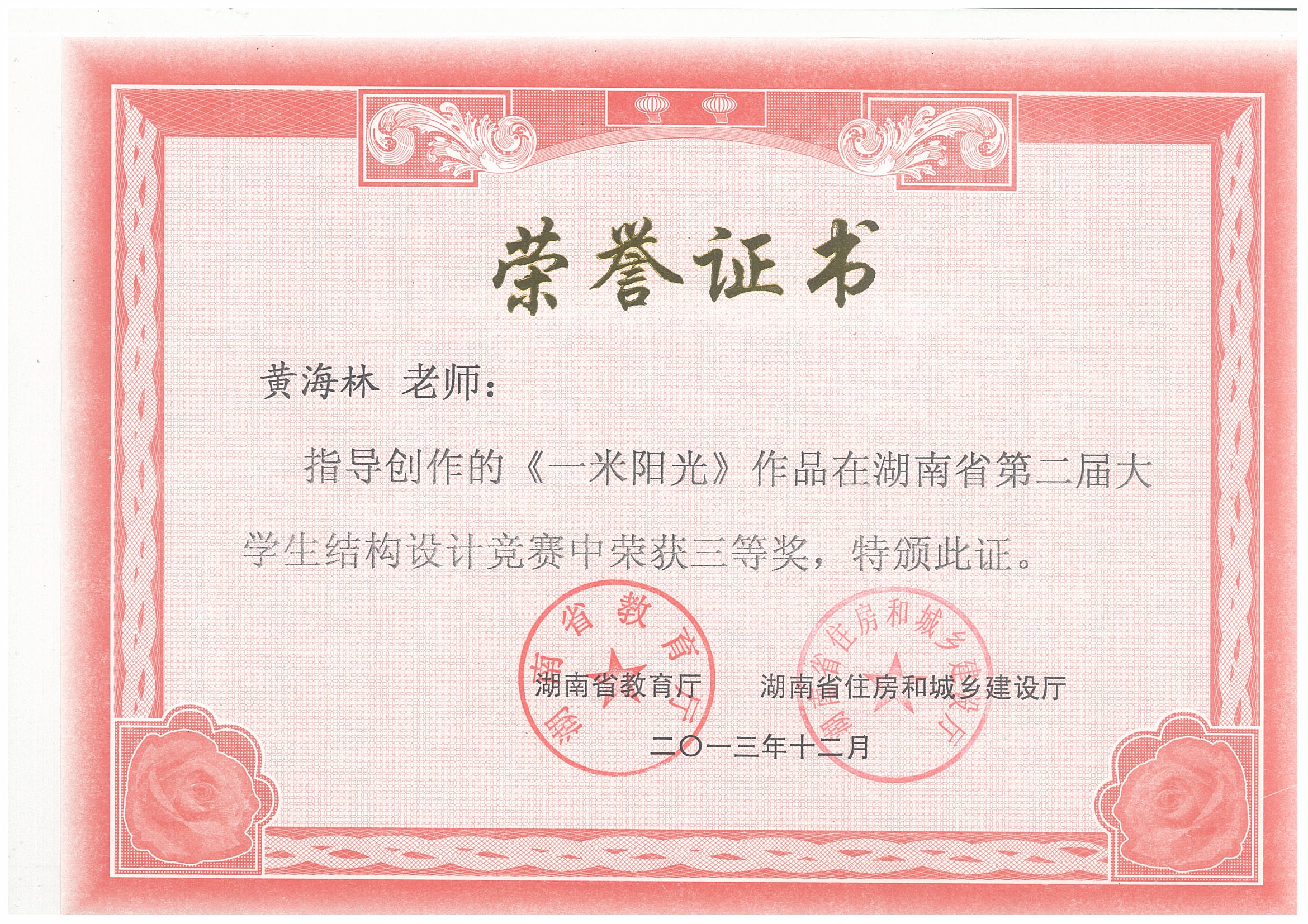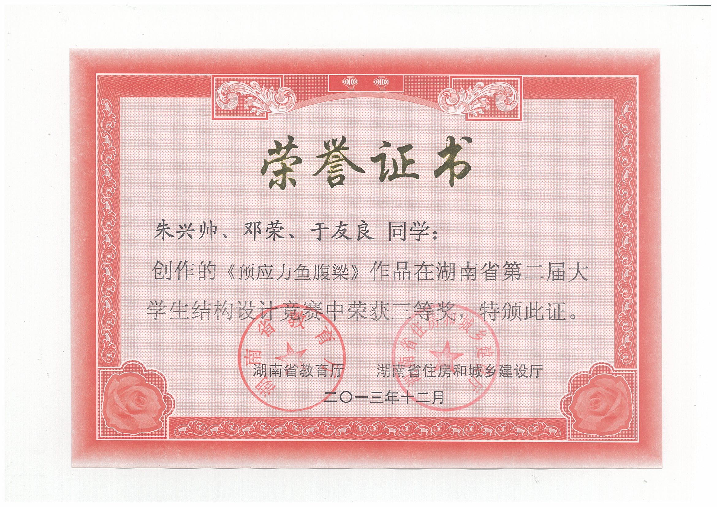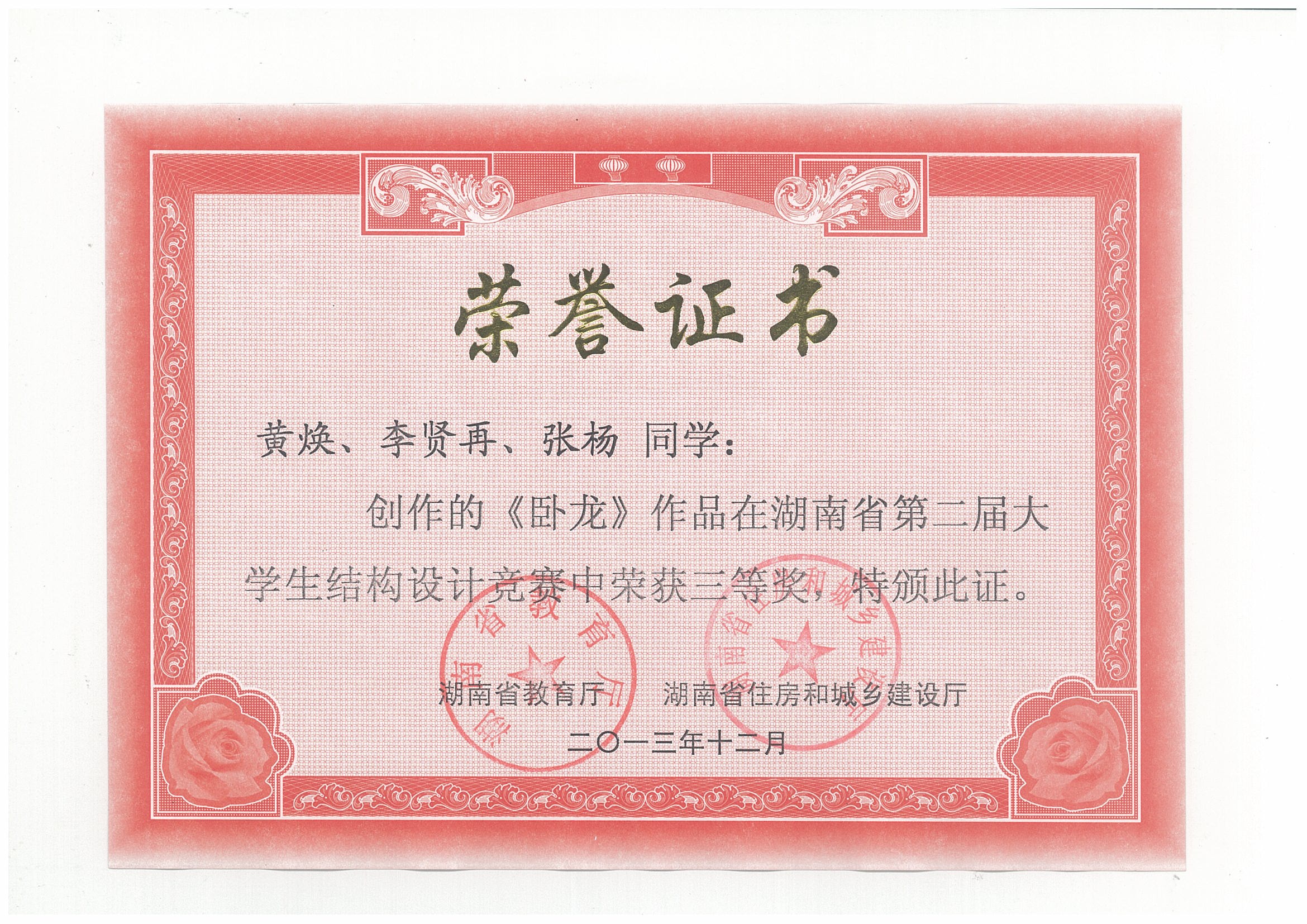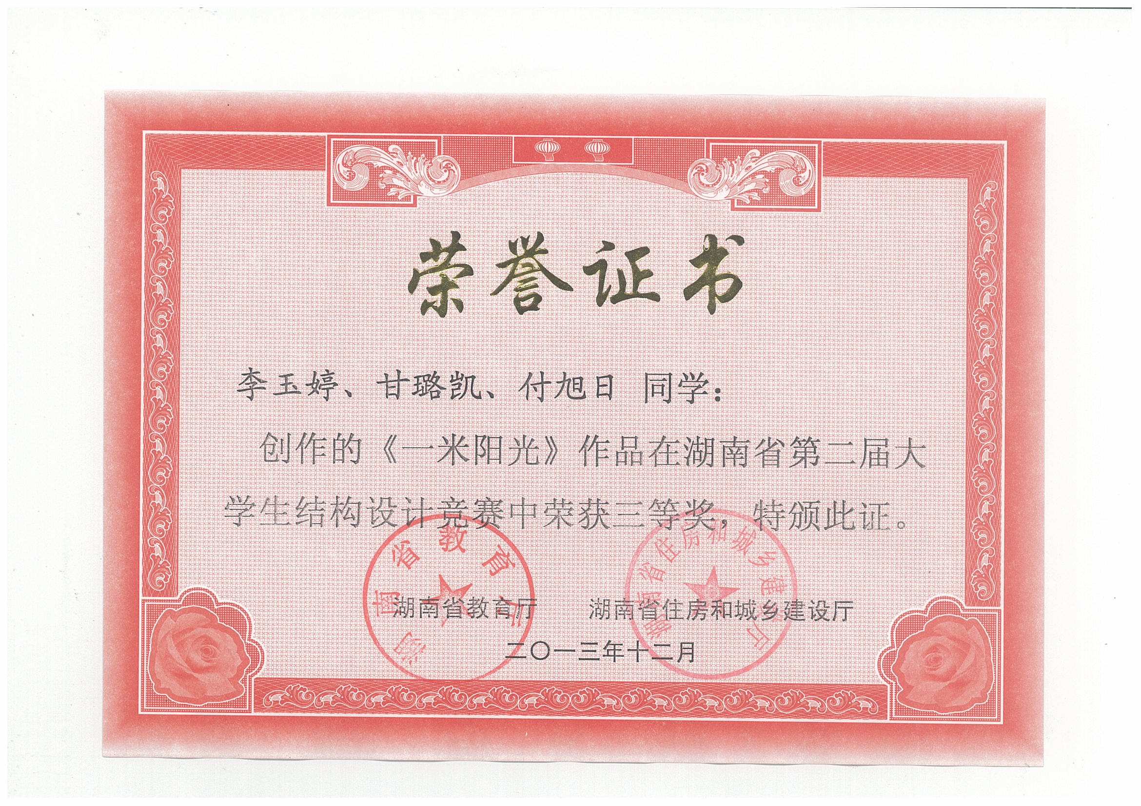 湖南省第二届大学生结构设计竞赛于2013年12月6日至9日在湖南城市学院举行,共56支参赛队伍参加了本届竞赛。足球一世官网组织和选派了4支队伍参加了本次比赛,最终沈明燕和舒小娟两位老师共同指导的参赛作品“我心永桁”荣获二等奖,黄海林、汪建群、李永贵等三位老师指导的作品也均荣获三等奖,团体总成绩进入本届赛事的全省前四,实现了大学生结构设计竞赛相关建设的飞跃式发展。