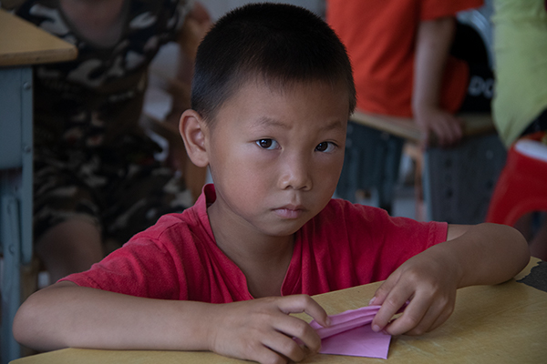 课堂上,志愿者们首先向孩子们介绍了即将制作的折纸作品——带有翅膀的爱心,然后为孩子们讲解折纸的步骤,细致解说,反复演示。孩子们被分为四组,每一组有两位志愿者从旁指导。孩子们边听边学,努力地完成自己的作品,遇到不会的步骤时向志愿者们请教,在志愿者的协助下共同完成折纸作品。在此之后,志愿者们给每位孩子分发了一支笔,并与孩子们一起在作品上写下他们想要感恩的人。“老师,袁隆平爷爷怎么写?”“老师,你的名字怎么写?”孩子们纷纷举手提问,志愿者们俯身握住孩子的手,一笔一划地教孩子们写下他们心中所想的名字。