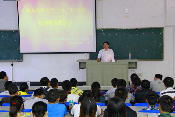 10月3日上午,足球一世官网在第一教学楼104教室举办了优秀校友报告会,足球一世官网皇晓东老师、贺建清老师等多位老师与2000级和2004级城市地下与工程专业多位优秀校友参加了此次报告会。